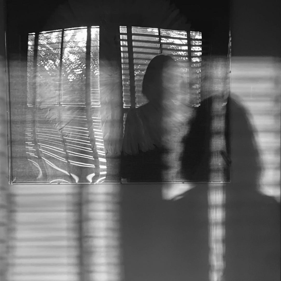 Horizontal blinds slice the image into bands of light and dark; through the window, foliage grows; a human figure—you—sits in the center-right as a soft silhouette, the least defined object in the frame. Your image is dissolving. Are the blinds shelter or bars?